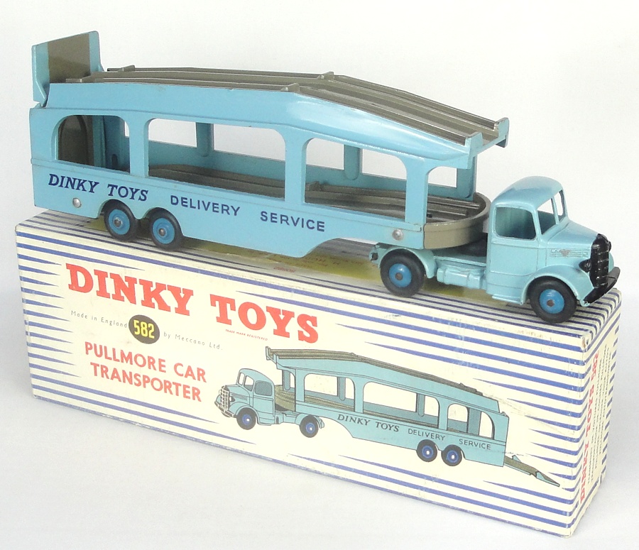 Dinky 582 Pullmore Car Transporter. Light blue with fawn decks. Very near mint/boxed. U.S. export box. From a beautiful, single-owner collection, some 25 years in the making.