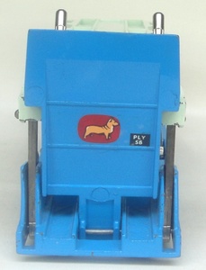 Issued between 1957-62, this popular Corgi Major model has a bright red cab, light blue transporter body (complete with hinged ramp), and flat spun hubs. Black cab base (often found with a grey base) and this is the version without silver deck details.