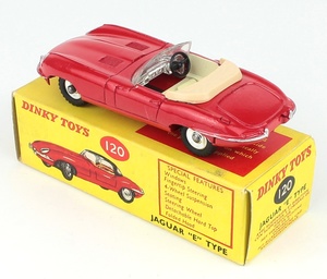 Dinky 120 Jaguar 'E' Type. Very near mint/boxed, with perspex packing strip. Red with a black roof. Complete with both detachable hard top roof & folded hood. From The Heart of England Collection.