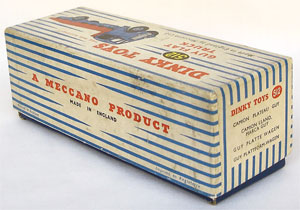 The blue and white striped picture box is complete and bright with no splits or graffiti ? not even a shopkeeper?s price! Minor age wear/grubbiness only. Red spot at the lid end. Dinky stamp inside the box lid dates this model from 1955.