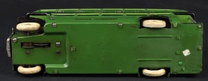 Rare to come to the market-place. This early issue from 1936, is finished in original deep & mid-green. Virtually complete ‘BOVRIL’ lettering on both sides. Complete delicate transfer at the rear for ‘BISTO’. Intact radiator and headlight assembly. ‘Mitcham THE CRICKETERS’ destination at the front and ‘MITCHAM’ destination at the rear with registration AYV 604. Wooden seating (one loose). Working clockwork function. Noteworthy that all four white tyres have survived well, with minor wear only.