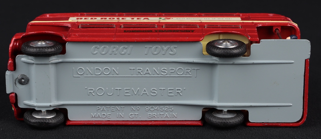 A scarce Canadian promotional Routemaster Bus with complete decorative ‘Red Rose Coffee’ transfers on one side, and ‘Red Rose Tea’ transfer on the other.