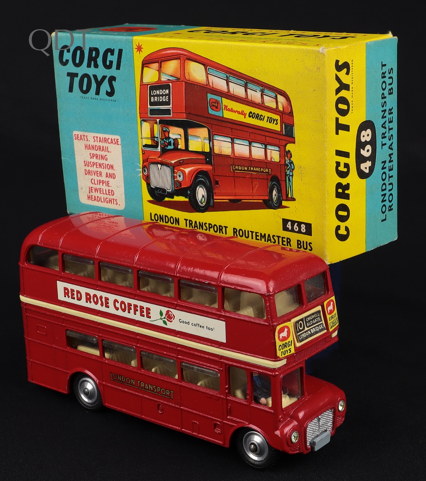 London Transport Routemaster Bus "RED ROSE TEA/COFFEE" & 'BLUE RIBBON SPICES' at the rear. Very near mint/boxed. Very scarce Promotional Model. QDT starting bid £300. Please note that QDT apply 12.5% buyer's commission.