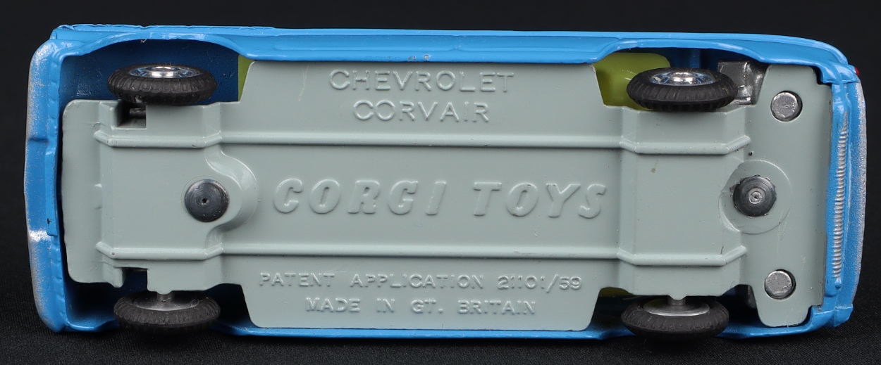 Chevrolet Corvair by Corgi Toys, No. 229. VIBRANT MID-BLUE issue. Very near mint/boxed. From The Elmer Collection.