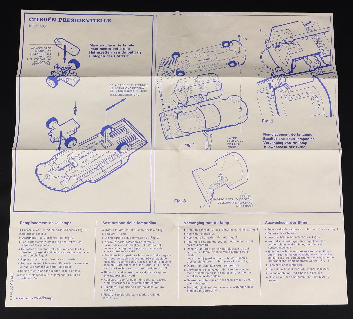 Citroen Presidentielle by French Dinky Toys, No. 1435. Very near mint/boxed. Includes original flag, bonnet emblem (later eeplacement label) and Instruction Leaflet. From The Berlin Collection.