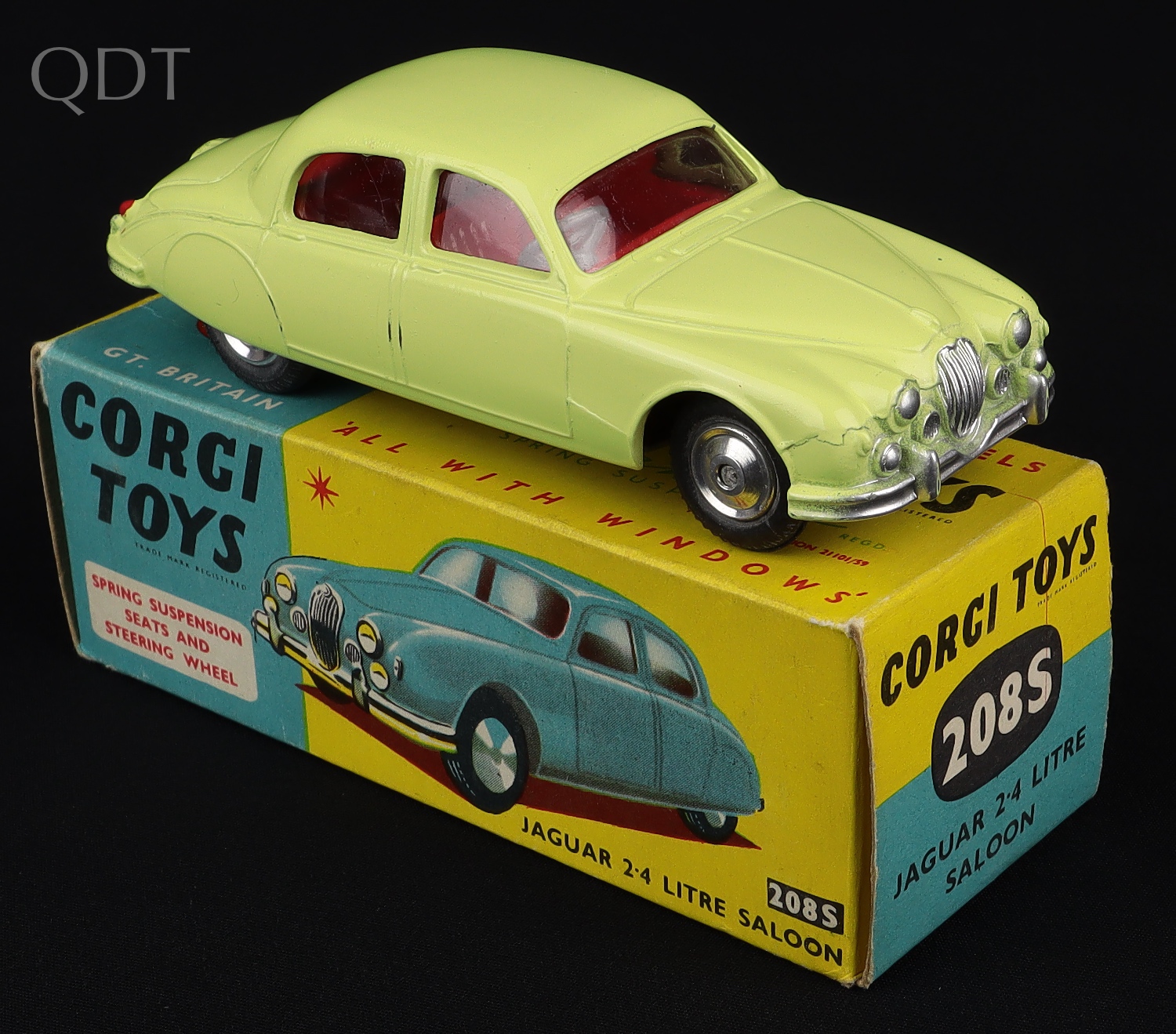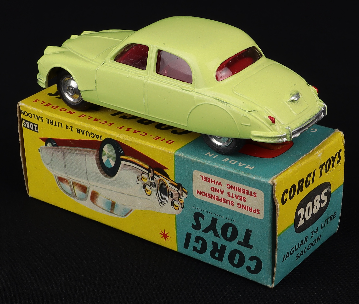 Jaguar 2.4 litre Saloon by Corgi Toys, No. 208S. Lemon version with suspension on shaped spun wheels. Very near mint/boxed. Fresh box! From The Reigate Collection.