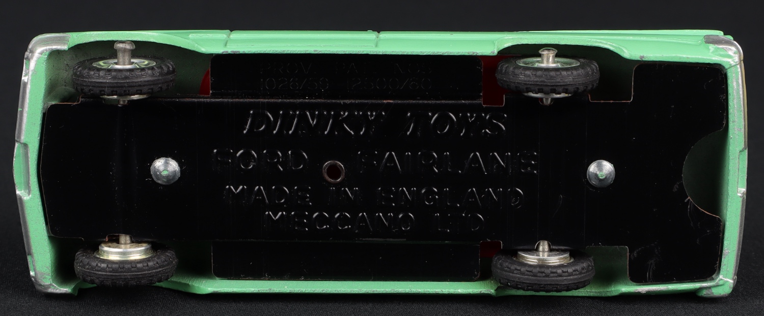 This scarce version of the Ford Fairlane has a bright pea green finish with a vivid red interior (more usually found with a cream interior). Suspension on shaped spun hubs. Bright baseplate and open front windows. Fine, well-shaped tyres.