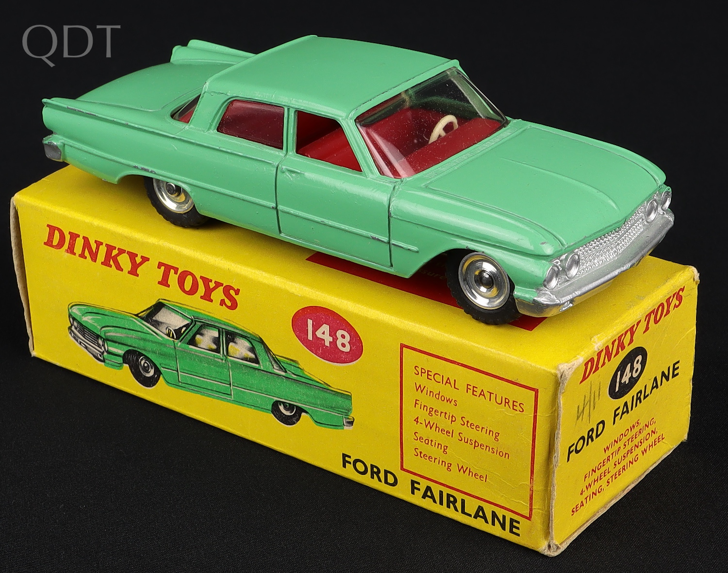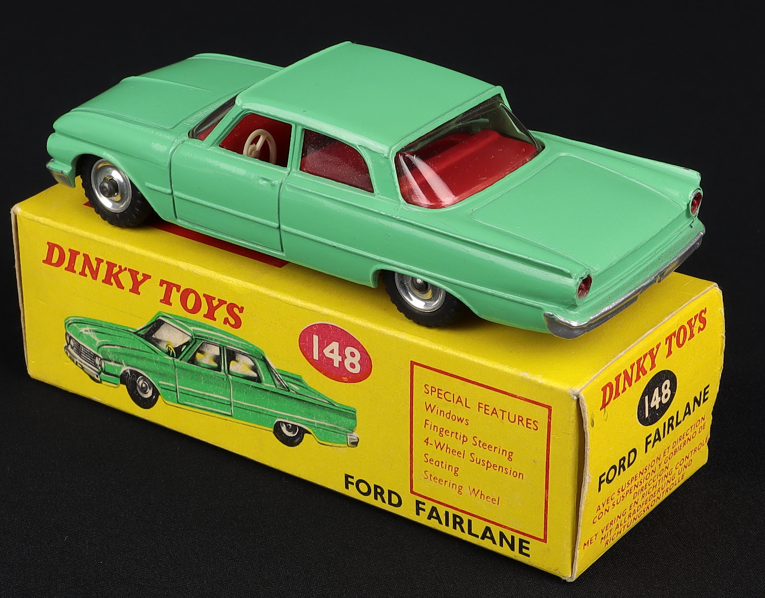 Ford Fairlane by Dinky Toys, No. 148. Near mint plus/boxed. Nice box! Scarce issue in pea green with a RED INTERIOR, shaped spun wheels. From The Rickman Collection.