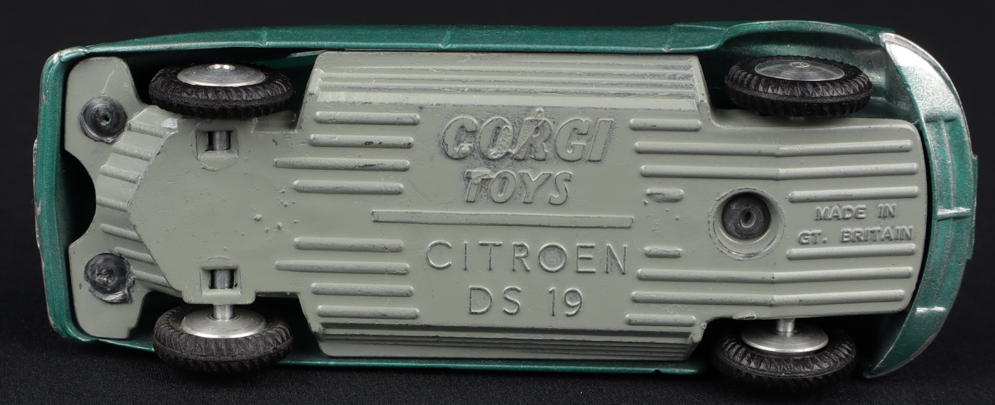 Citroen D.S. 19 by Corgi Toys, No. 210. Metallic green & black version - WITHOUT the mechanical 'bulge' on the base. Very near mint/boxed. From The Elmer Collection.