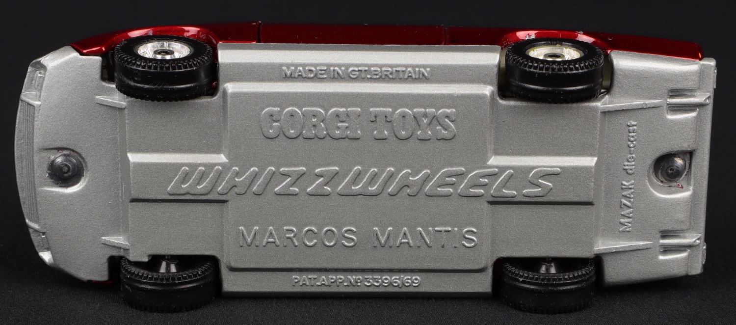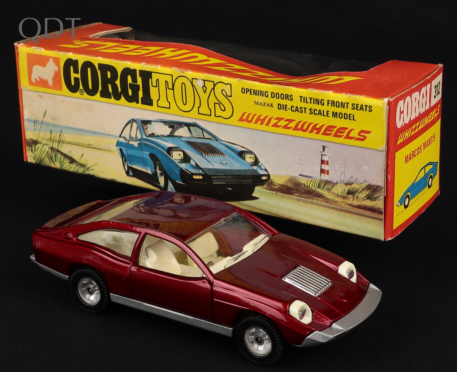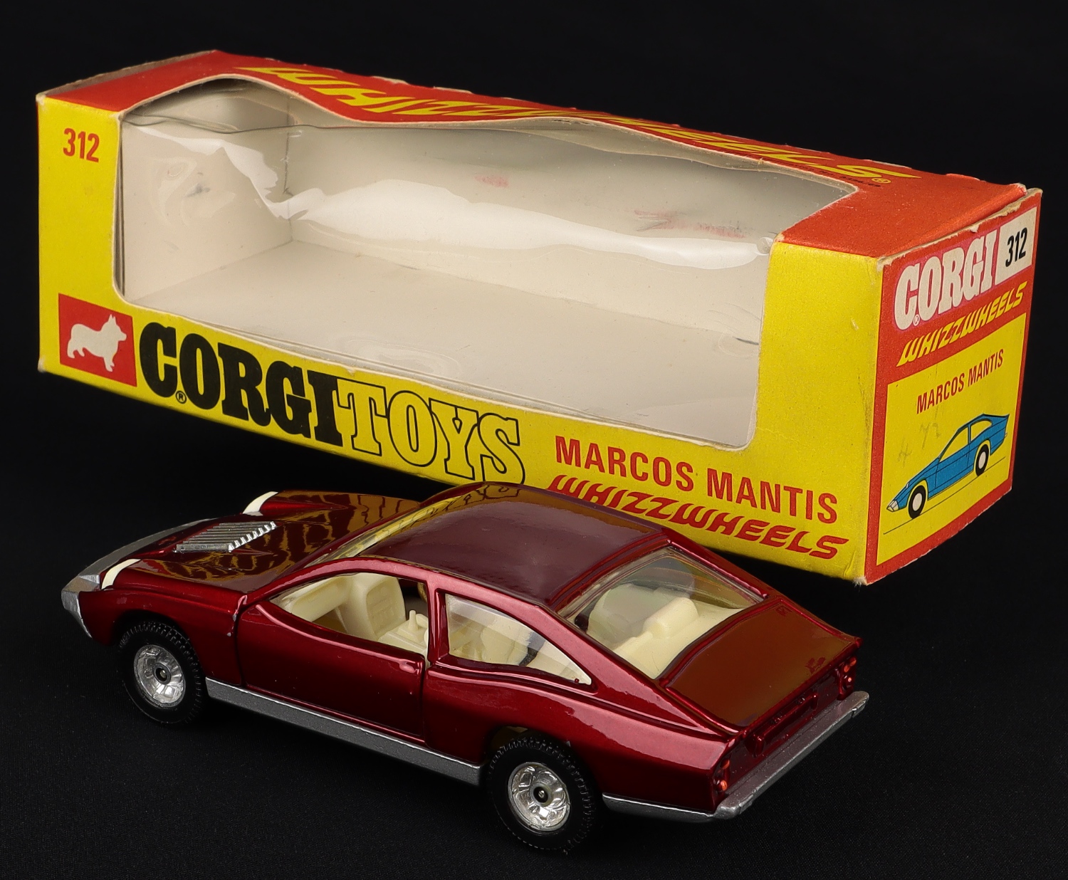 Marcos Mantis by Corgi Toys, No. 312. Very near mint/boxed. Rare find with SOLID whizzwheels. Circa 1972. Super box! From The Gower Collection.