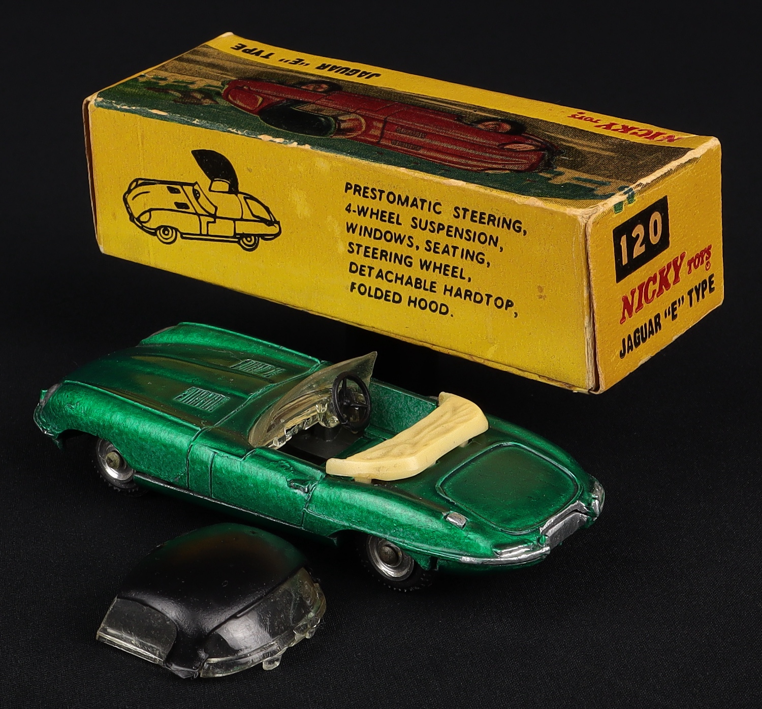 Jaguar 'E' Type by Nicky/Dinky Toys, No. 120. EMERALD GREEN issue with fawn soft top & black hardtop. SPUN WHEELS issue. Very near mint/boxed. From Boris's Collection. QDT starting bid £750. Please note that QDT apply 12.5% buyer's commission.