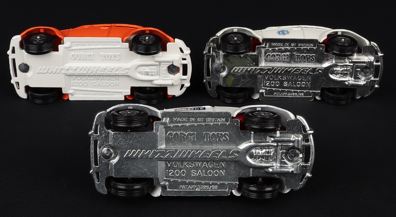 3 x selection of Volkswagen 1200 Beetles by Corgi Toys, No. 373 POLITIE , 373 POLICE & 383 VW Beetle. Scarce in orange with an OFF-WHITE interior. Very near mint - very, very near mint/unboxed. From The Bluehouse Collection.