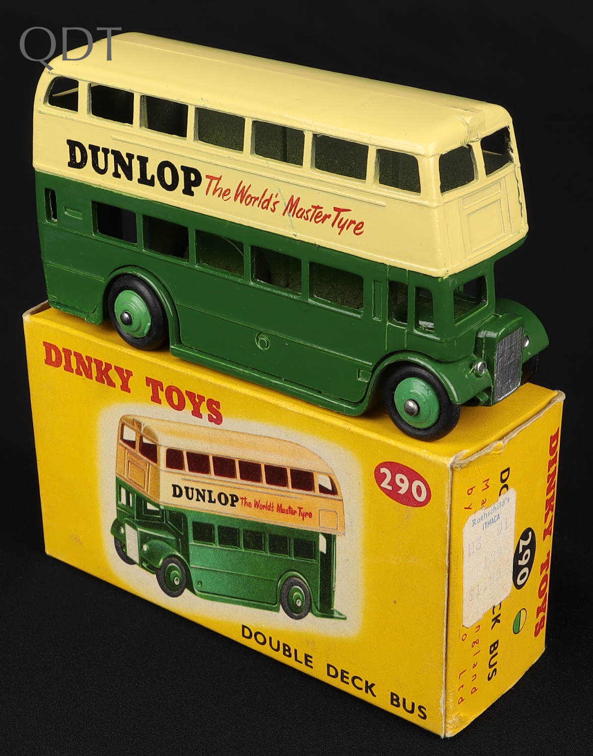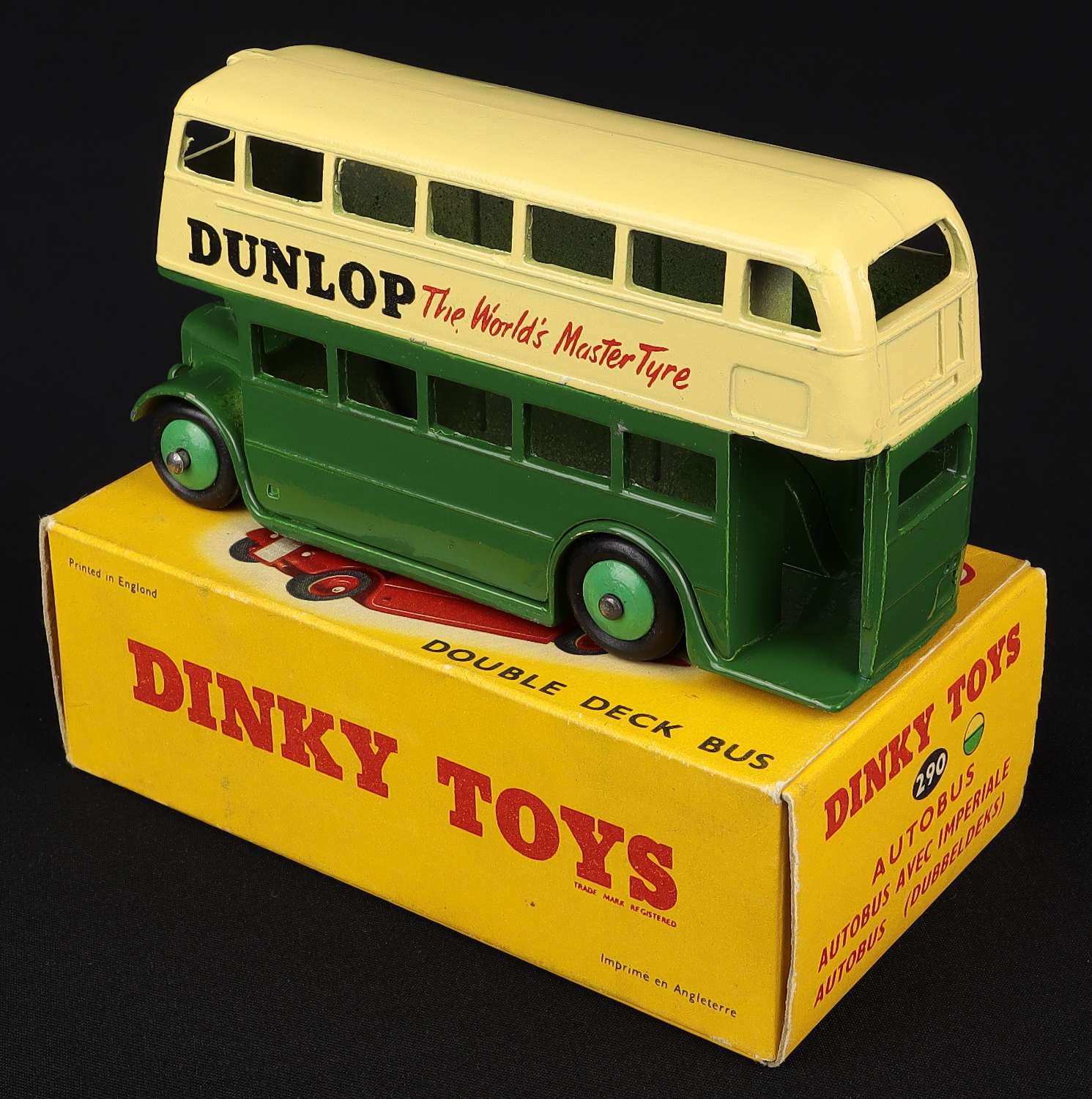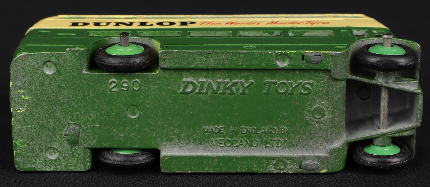 Double Deck Bus 'DUNLOP' by Dinky Toys, No. 290. Very near mint/boxed. DEEP Green & cream type 3 issue with UPRIGHT DUNLOP Print. Lighter green wheels. From The Denis Tyler Collection. Starting bid £100. Please note that QDT apply 12.5% buyer's commission.