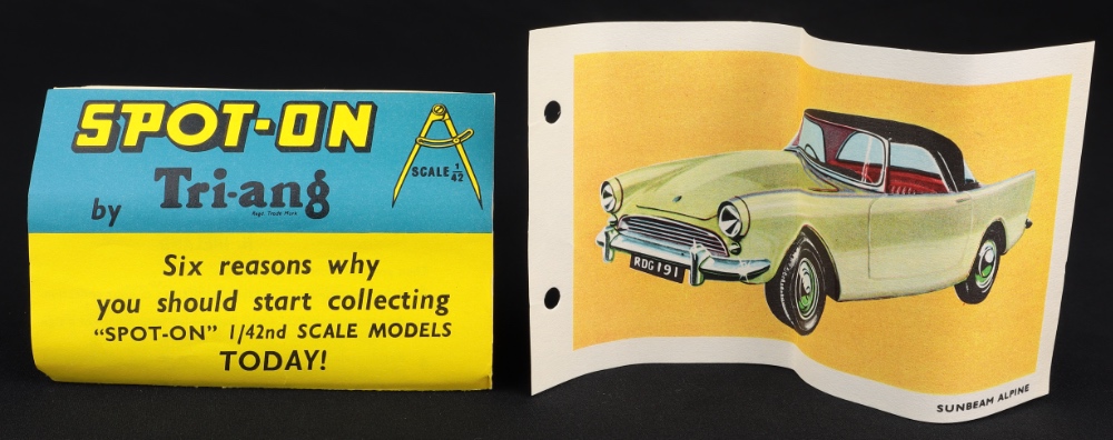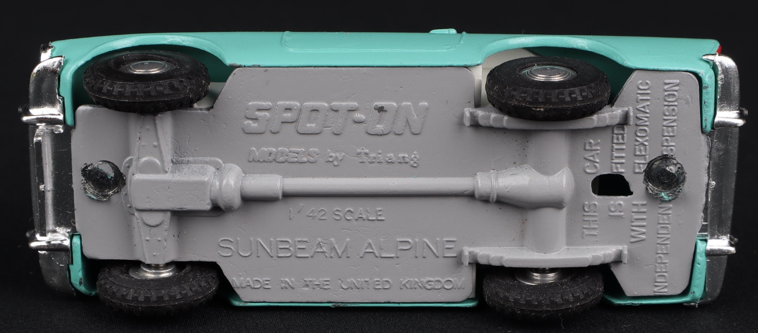 Sunbeam Alpine Convertible by Spot-on, No. 191. TURQUOISE issue with WHITE interior. Scarce. Very, very near mint/boxed, with card packing wedge, Picture Card & promotional leaflet. From The 25 Year Collection in California. QDT starting bid £200. Please note that QDT apply 12.5% buyer's commission.