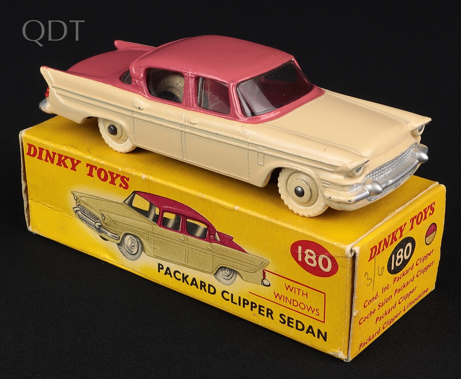 Packard Clipper by Dinky Toys, No. 180. Pale cerise & cream, cast wheel version. Very near mint/boxed. From The Rickman Collection.