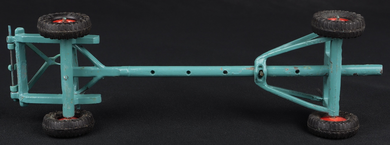 From the mid-1950’s, this is a delightful all original item from the ‘Britains Farm’ series of models. This unusual example has a distinctive blue metal trailer, red metal wheels (front swivelling). Intact blue metal tow bar and posts. Original real wood log. Fine and well-shaped original tyres.