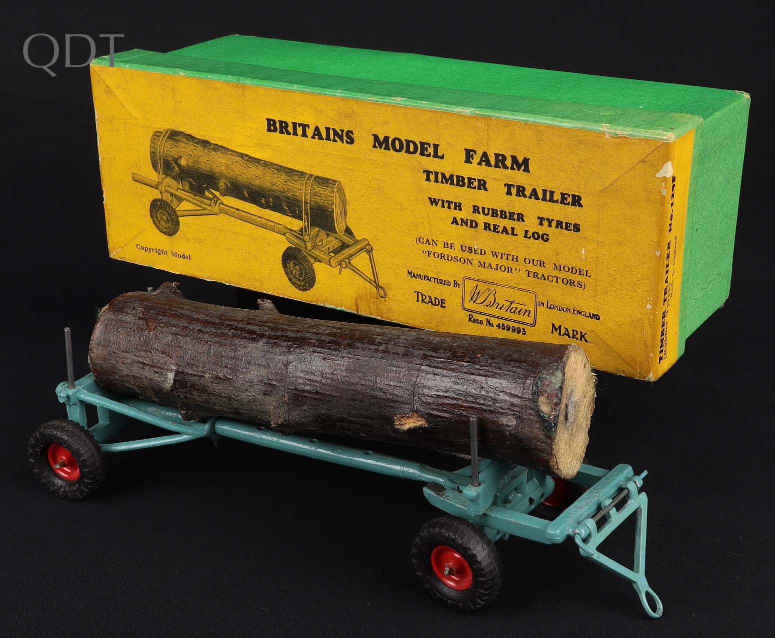 Timber Trailer by Britains, No. 129F. Near mint plus/boxed. Scarce early issue with light blue trailer, red wheels & lift-off lid box. From The Denis Tyler Collection. Starting bid £100. Please note that QDT apply 12.5% buyer's commission.