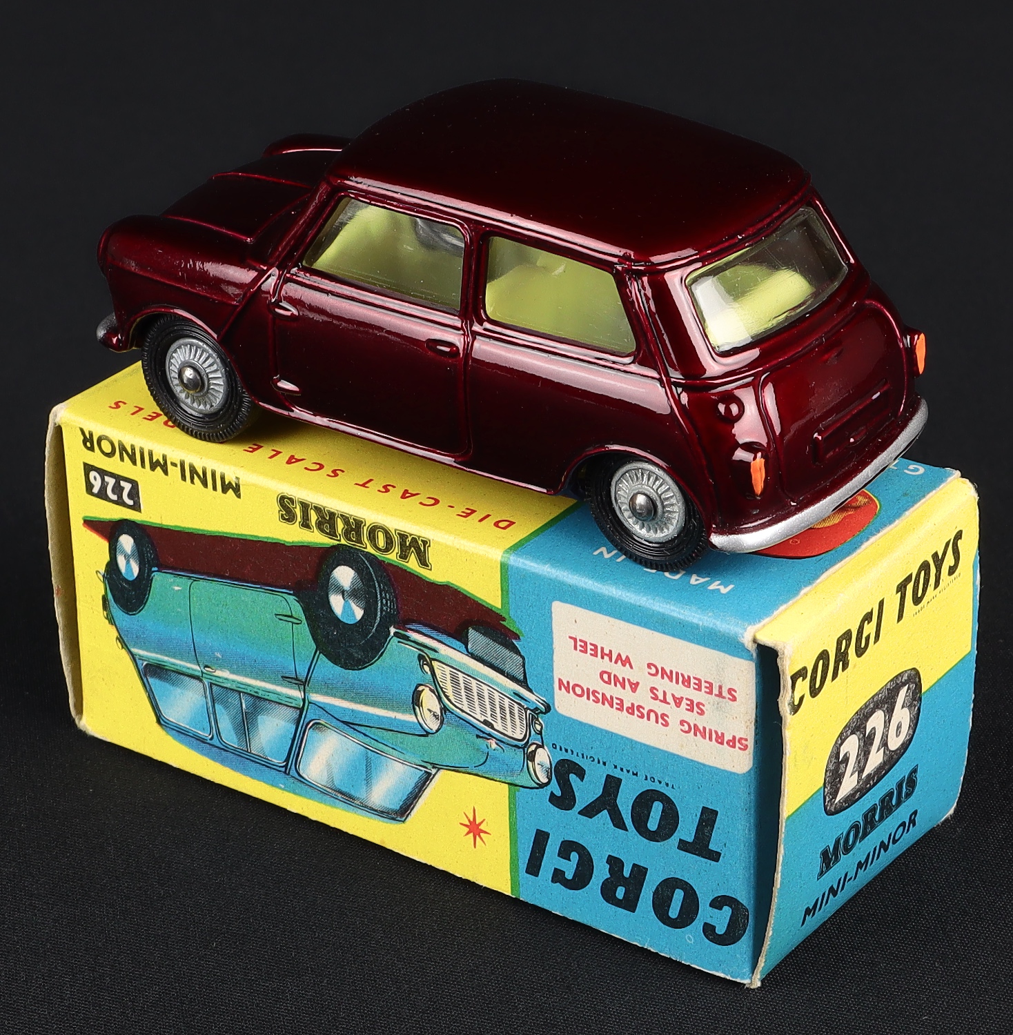 Morris Mini Minor by Corgi Toys, No. 226. Maroon version with cast wheels. Late issue base. Very near mint/boxed. Nice box! From The Reigate Collection.