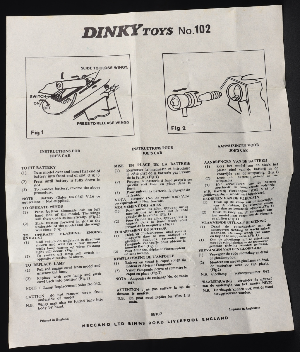 Joe's Car (Gerry Anderson's Joe 90) by Dinky Toys, No. 102. Very near mint/boxed. With WORKING FLASHING LIGHT function. In pictorial card box. With Instruction Leaflet & polystyrene packing. From The Heart of England Collection. QDT starting bid £250. Please note that QDT apply 12.5% buyer's commission.