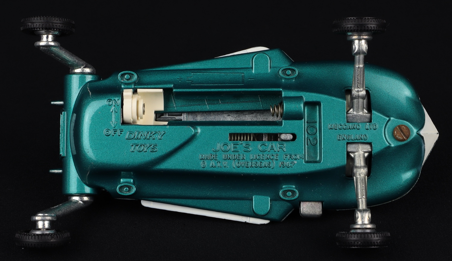 Inspired by Gerry Anderson’s t.v. series Joe 90. This Joe’s Car model has such a bright metallic green/blue finish with chrome engines, opening wings and extending tail fins. Suspension on all four wheels. Battery powered engine exhaust. Jewelled headlights. Intact windscreen and figure of Joe 90. Working battery-operated flashing light.