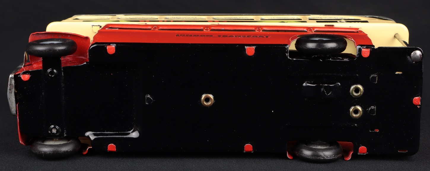 Issued during 1955-56, this Double-Decker Bus has a glossy red finish, with a cream mid-line, and a grey roof. Push & Go function. Most attractive colourful advertisements for ‘OVALTINE’ and ‘PEDIGREE PRAMS’ at the sides. Complete colourful transfer at the rear ‘Putney’. Small rear advert & registration LBL 174 are later paper label additions.