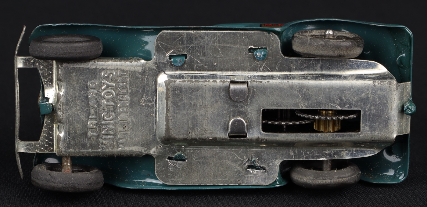 Shiny radiator and metal wheels. Black well-shaped smooth tyres. Working clockwork motor. With original key.