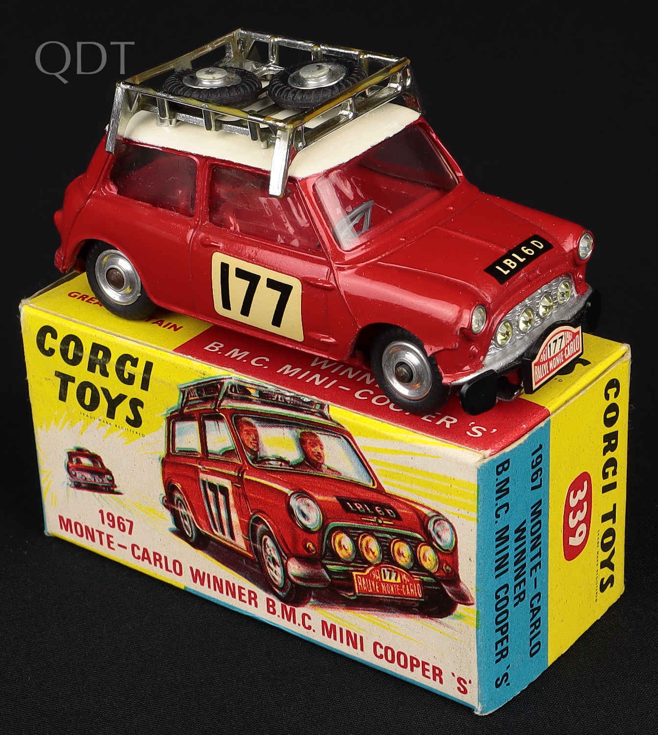 1967 Monte Carlo Winner B.M.C. Mini Cooper 'S' by Corgi Toys, No. 339. Austin grille. Near mint /boxed. Ist Issue with spun wheels. From The Elmer Collection.