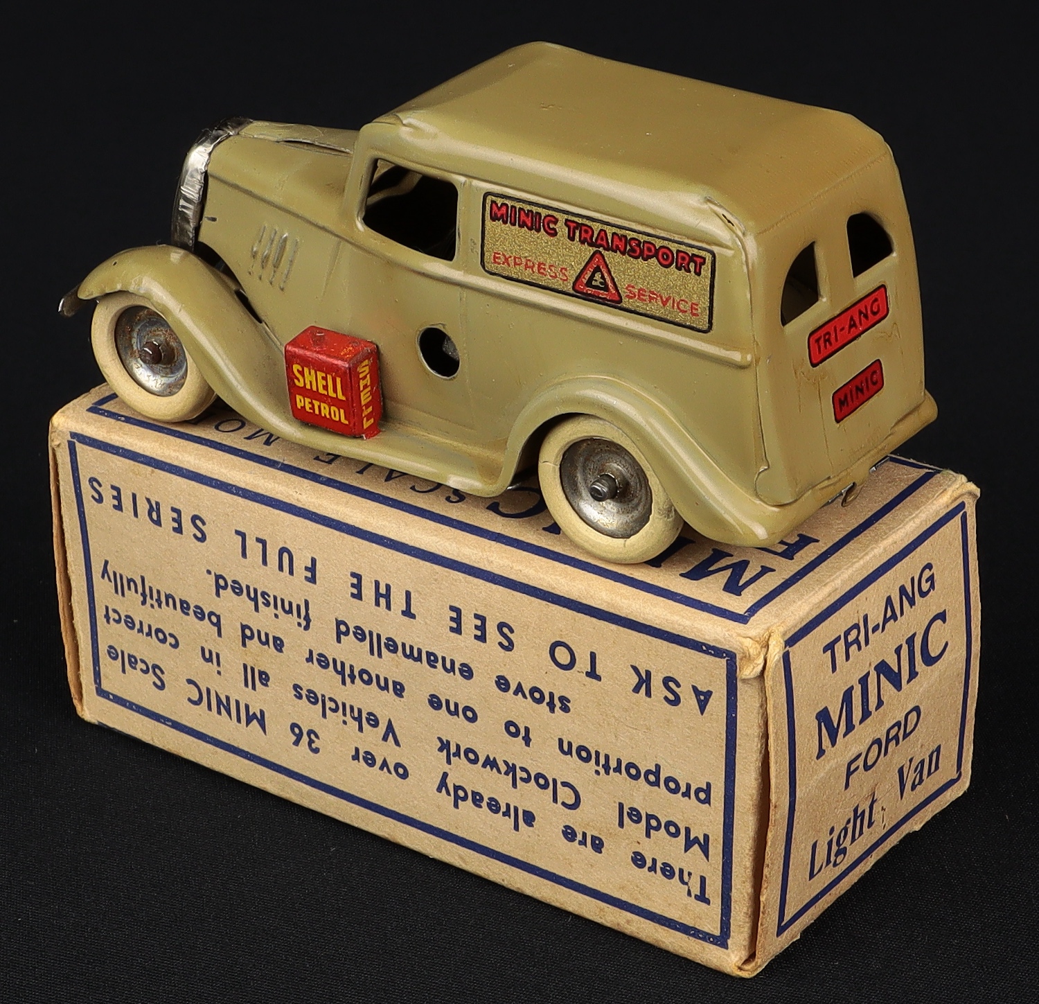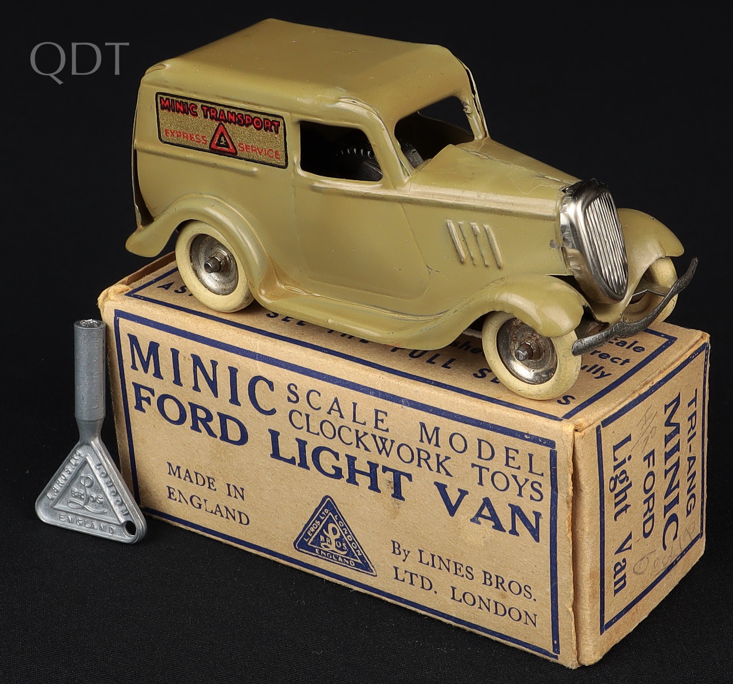 Ford Light Van by Minic Models, No. 2M. Working clockwork motor with original MINIC KEY. in BEIGE. Scarce PRE-WAR Issue. Near mint plus/boxed. From The Denis Tyler Collection. Starting bid £150. Please note that QDT apply 12.5% buyer's commission.