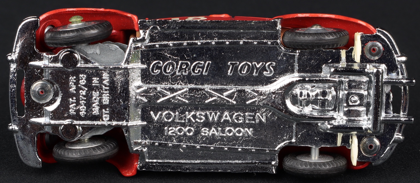 A very popular Corgi model – this example has a fine and gleaming scarlet paint finish. The left-hand drive version has a notably complete detailed bonnet label (tiny wear), complete door numbers and “Nairobi” label (light wear). Chrome bumpers, wheels, baseplate, and sparkling jewelled headlights.