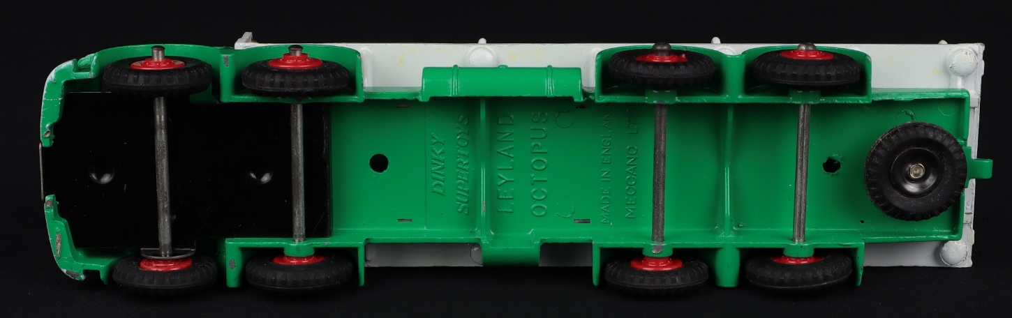 Leyland Octopus Flat Truck with chains by Dinky Toys, No. 935. Scarce green and pale grey version. Very near mint /boxed. From The Rickman Collection.