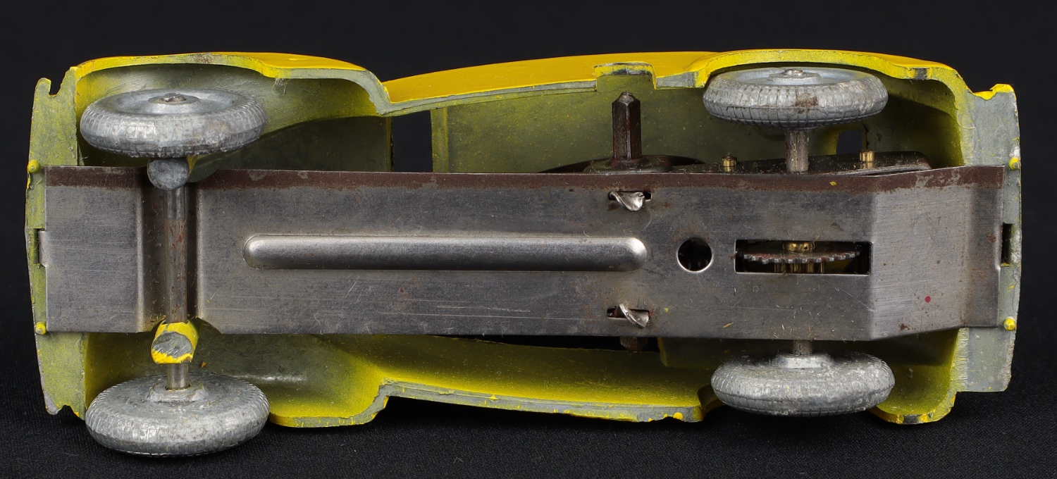 Finished in vibrant yellow with silver trim, this working clockwork Vauxhall saloon is not an easy find. One piece metal tyres/wheels detail and no glazing. Model measures approx 9.5 cms.