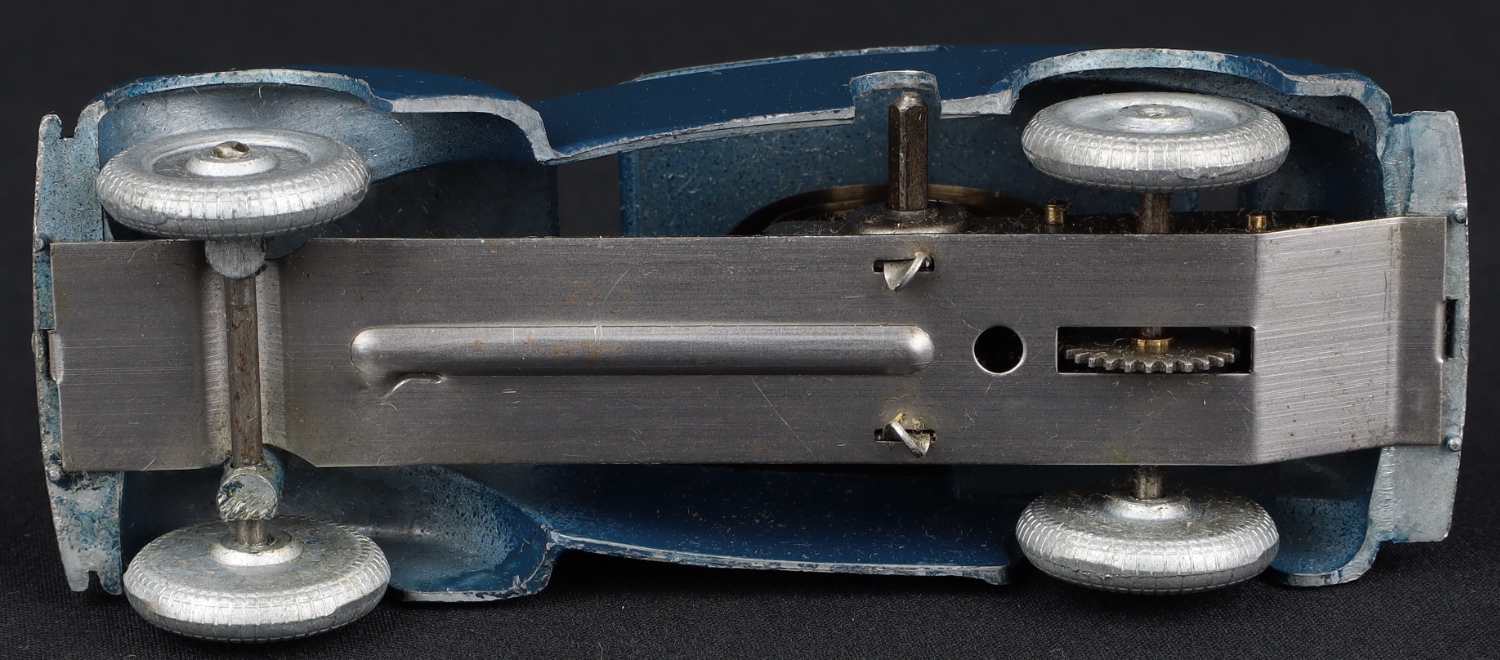 Finished in deep blue with silver trim, this working clockwork Vauxhall saloon is not an easy find. One piece metal tyres/wheels detail and no glazing. Model measures approx 9.5 cms.