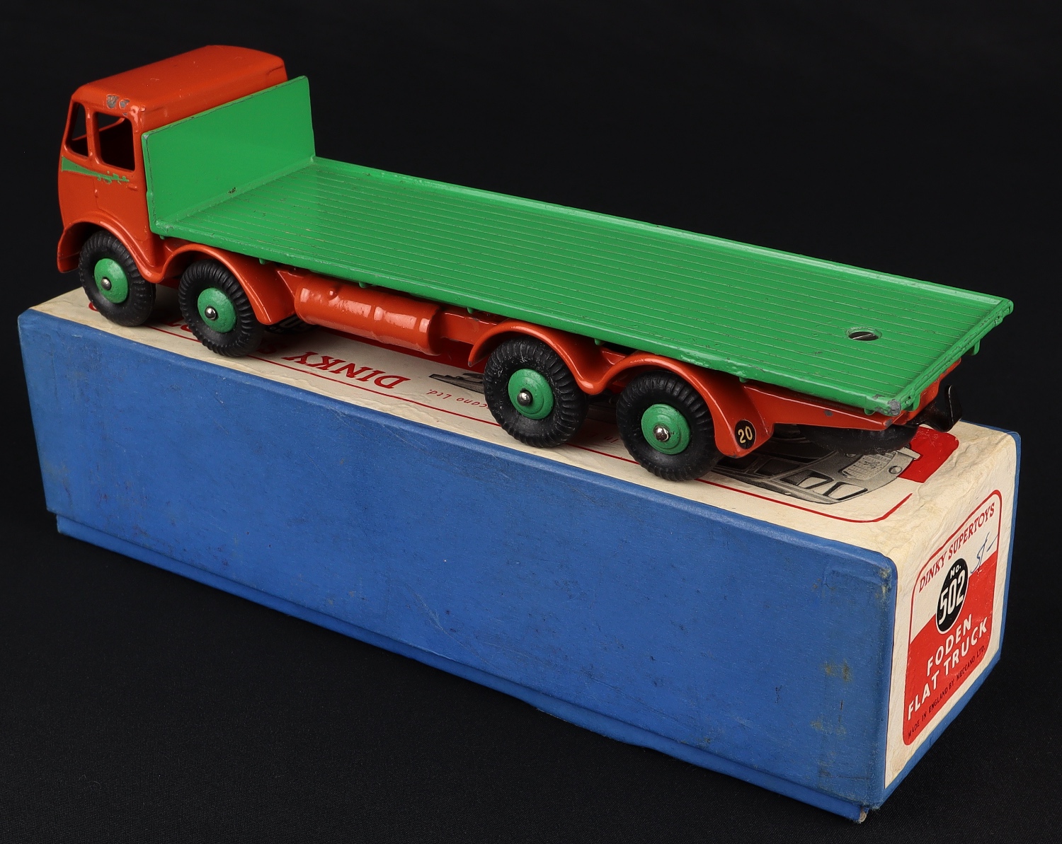 Foden Flat Truck by Dinky Toys, No. 502. Near mint /boxed. Scarce 1st issue in BURNT ORANGE and green. From a one owner from new collection.