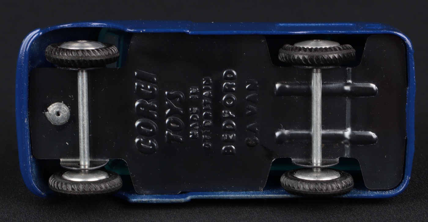 A gleaming vivid original vibrant blue paint finish on this early Bedford Van. One of the first Corgi models made, manufacture of this model began during 1956. Complete and bright ‘Daily Express’ label on one side (tiny edge nick on the other). Flat spun wheels, shiny base. Day-one fresh tyres with a fine tread.