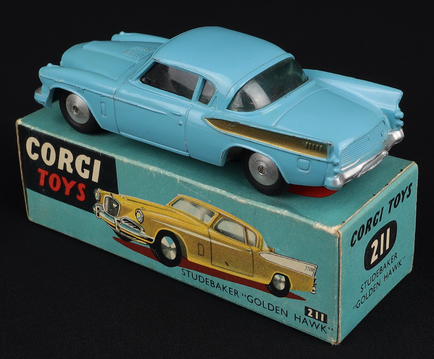 Studebaker Golden Hawk by Corgi Toys, N. 211. Near mint plus/boxed. Light blue with gold rear fins, flat spun wheels. From The Elmer Collection.