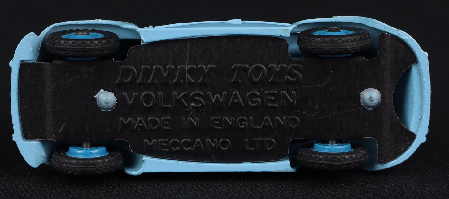 Volkswagen by Dinky Toys, No. 181. Very near mint/boxed. Very scarce issue in sky blue with blue plastic wheels. Crisp, bright box! From The Rickman Collection.