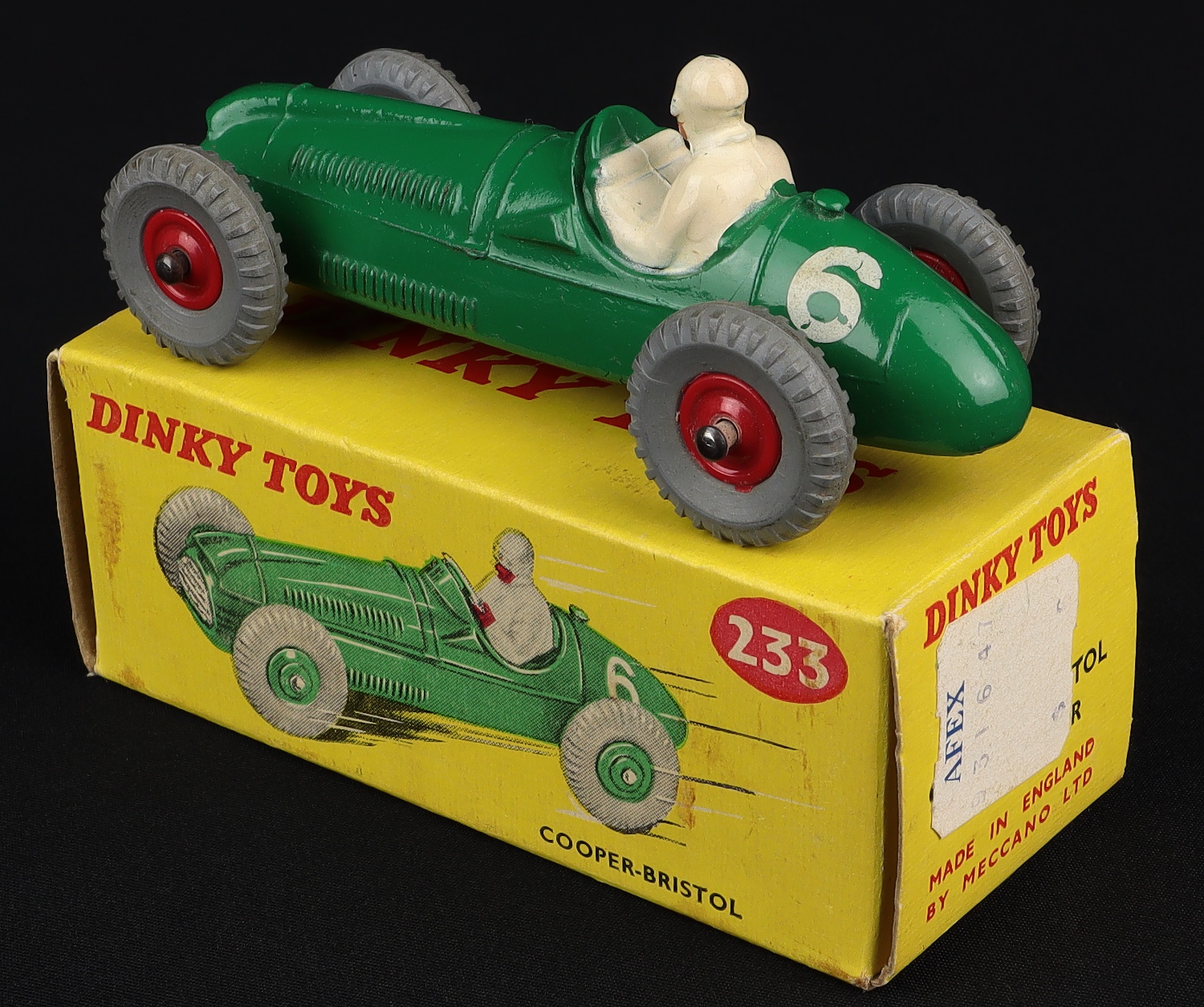 Cooper Bristol by Dinky Toys, No. 233. Very, very near mint/boxed. Scarce issue with spun aluminium wheels. Late issue picture box. From The Rickman Collection.