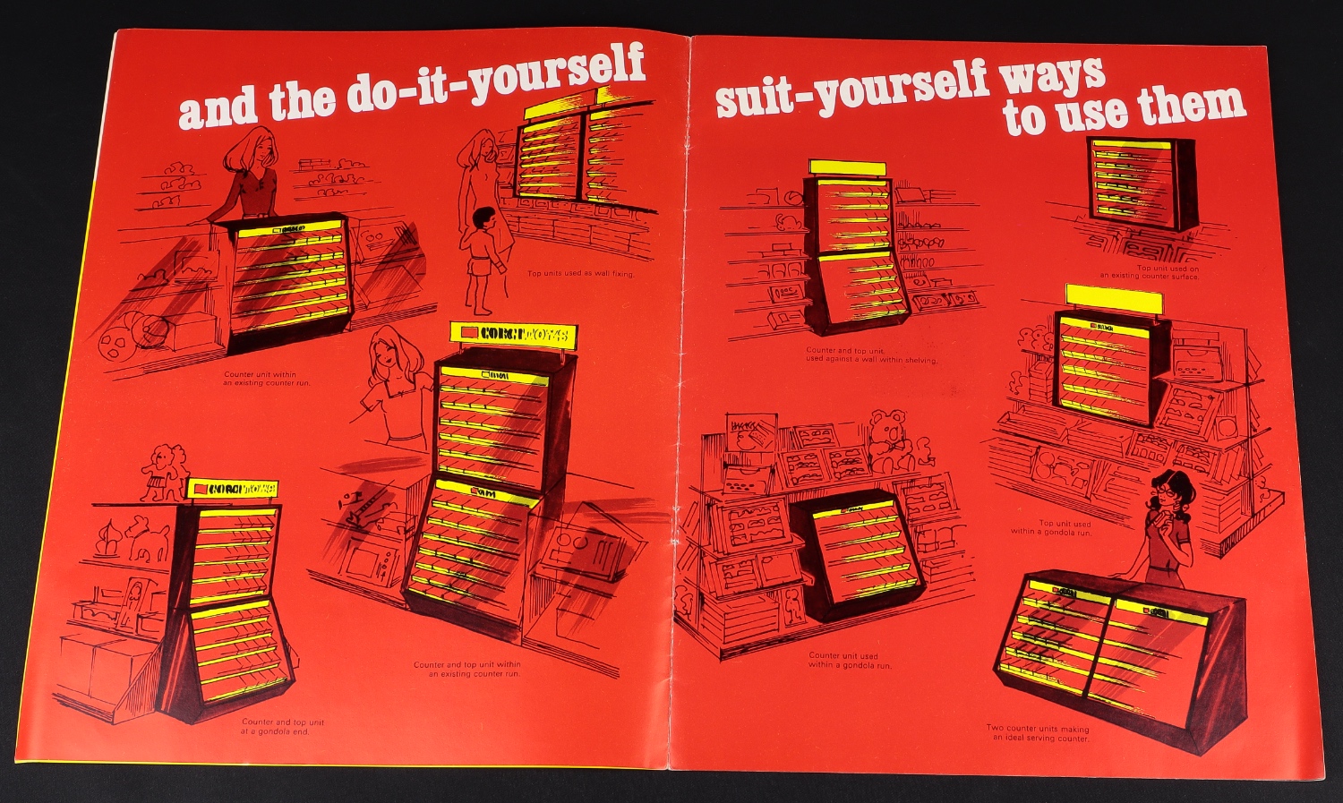 This engrossing magazine provides a little window into the world of the Corgi shopkeeper back in the day and provides us with an insight into the remarkable choice of display cabinets and promotional material available at the time, including signs, Corgi cabinets, card displays & tinplate shelving. Dazzling array of Corgi Rocket & Corgi Junior Stands as well!