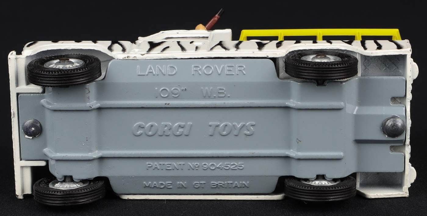 ’Zebra-striped Land-Rover with an intact circular ‘LIONS OF LONGLEAT’ label on the bonnet. Opened hatch on the cab roof shows the keeper complete with the (usually missing!) rifle, although please do note that the rifle is incomplete. Cast wheels with suspension.