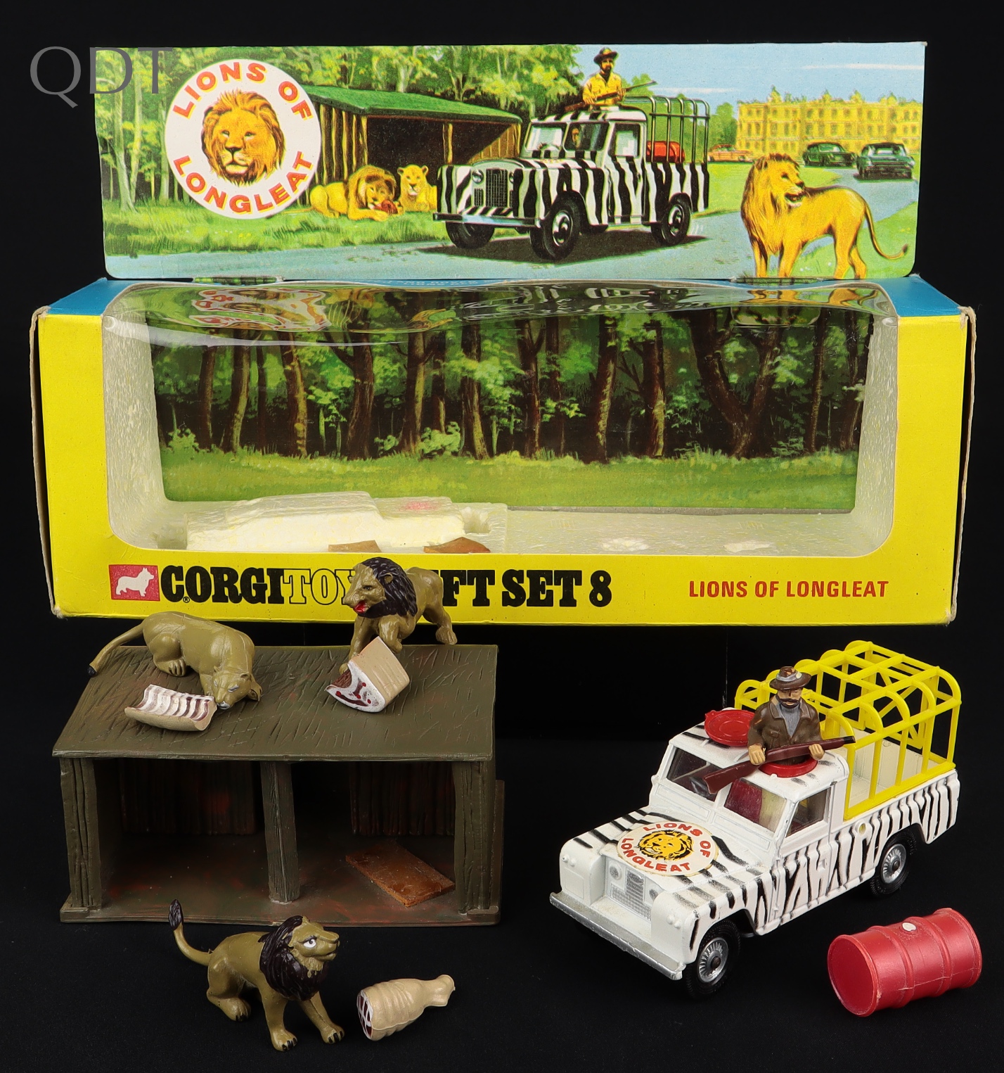 'Lions Of Longleat' Gift Set by Corgi Toys, Gift Set 8. Very near mint/boxed. CAST WHEEL issue. Complete with DETACHABLE HEADER CARD/RETAILER CARD. Scarce. QDT starting bid £200. Please note that QDT apply 12.5% buyer's commission.
