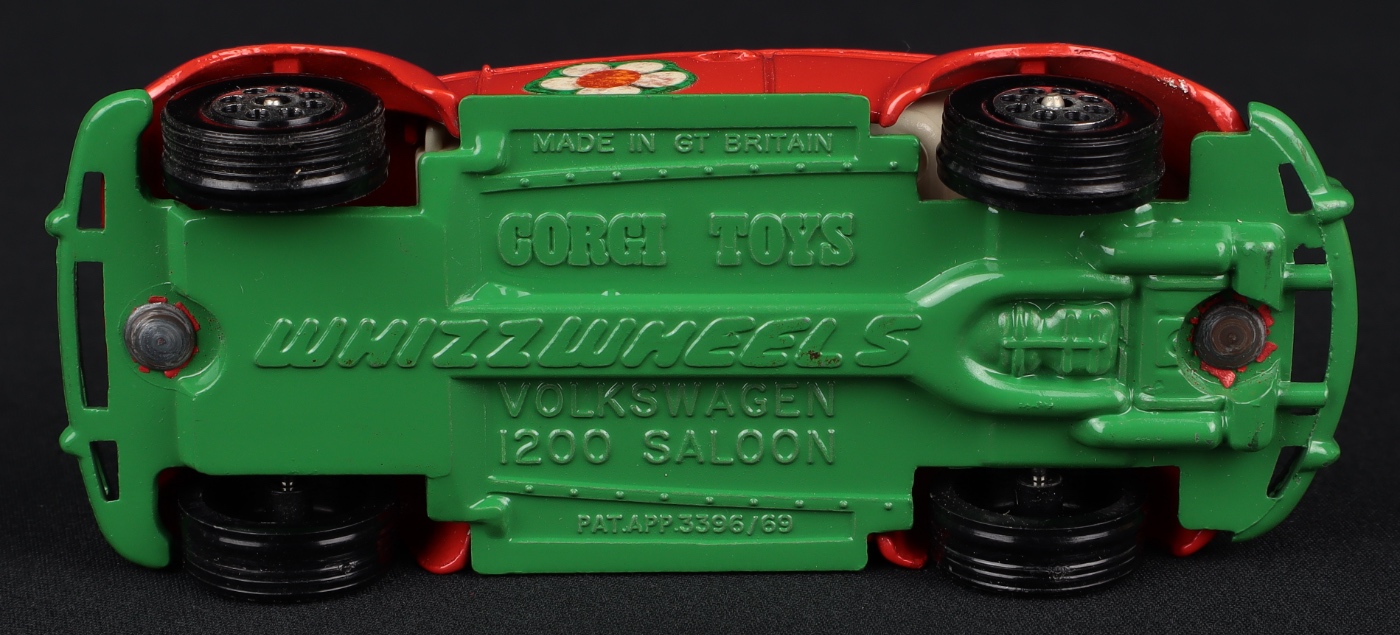 Volkswagen 1200 'Flower Power Beetle' by Corgi Toys, No. 383. Very, very near mint/boxed. With GREEN base & bumpers, WHITE interior, 'Pepperpot' Whizzwheels. From The Elmer Collection.