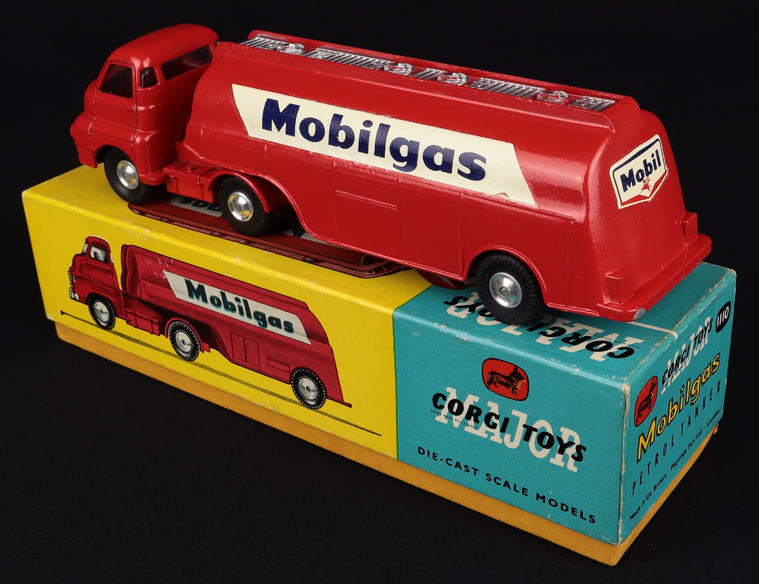 Mobilgas Petrol Tanker by Corgi Toys, No. 1110. Very near mint/boxed, with card packing. Shaped spun wheel issue. Scarce item from The Rickman Collection.