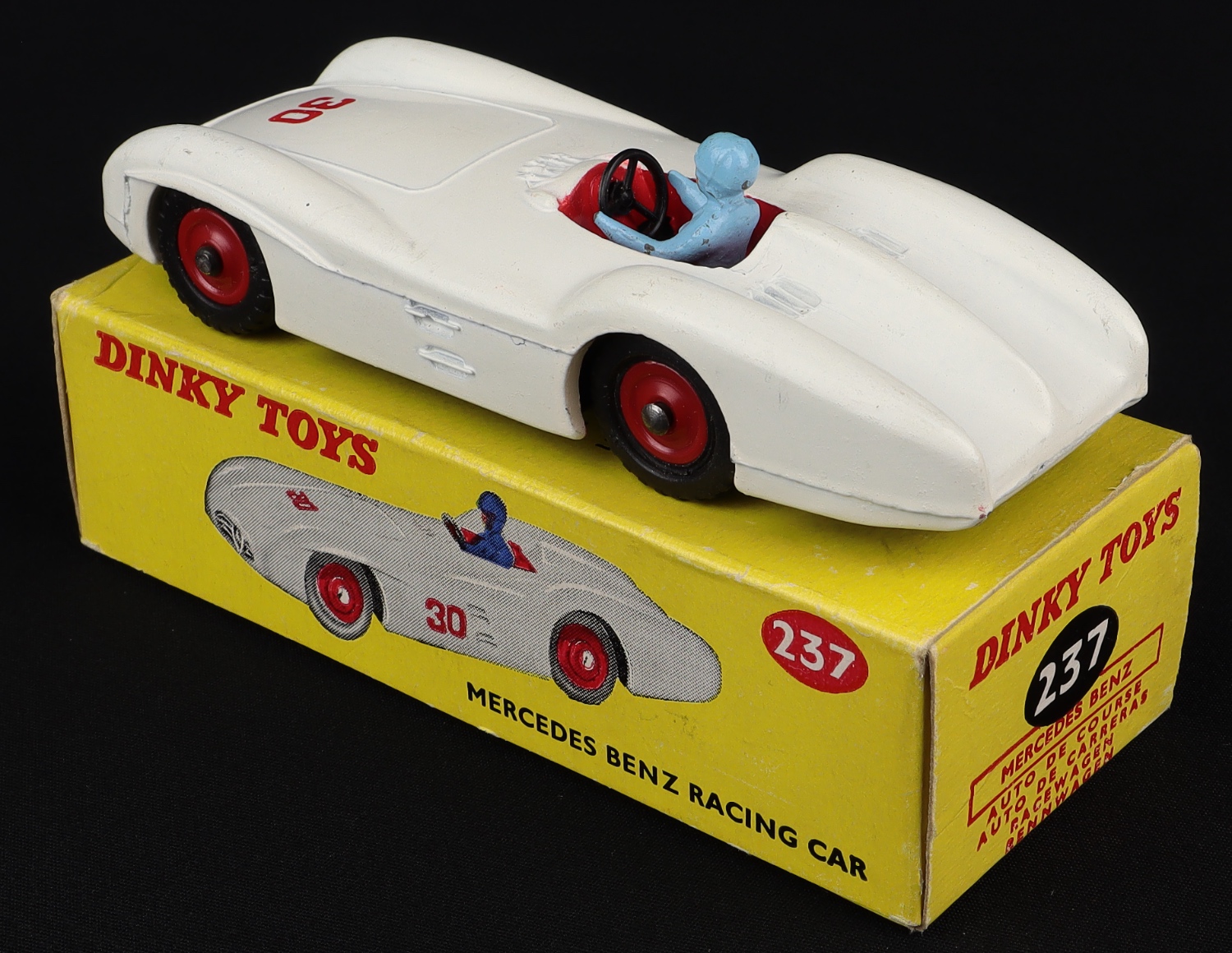 Mercedes Benz Racing Car by Dinky Toys No. 237. Scarce late version. Matt white, red plastic wheels, blue metal driver, plastic steering wheel. Interesting transition issue. Very, very near mint/boxed.