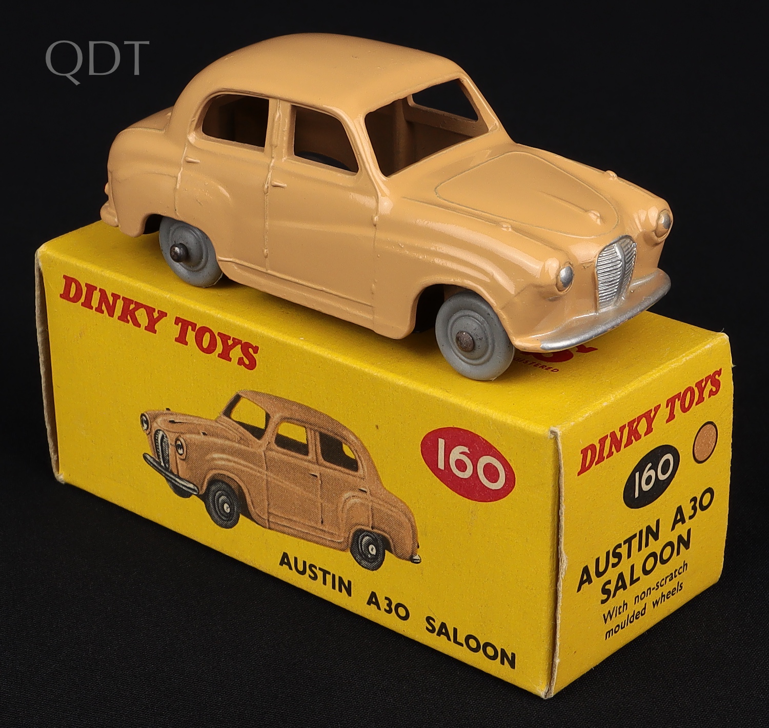 Austin A30 Saloon by Dinky Toys, No. 160. Fawn with SMOOTH grey wheels. Very, very near mint/boxed. Nice box! From The Rickman Collection.