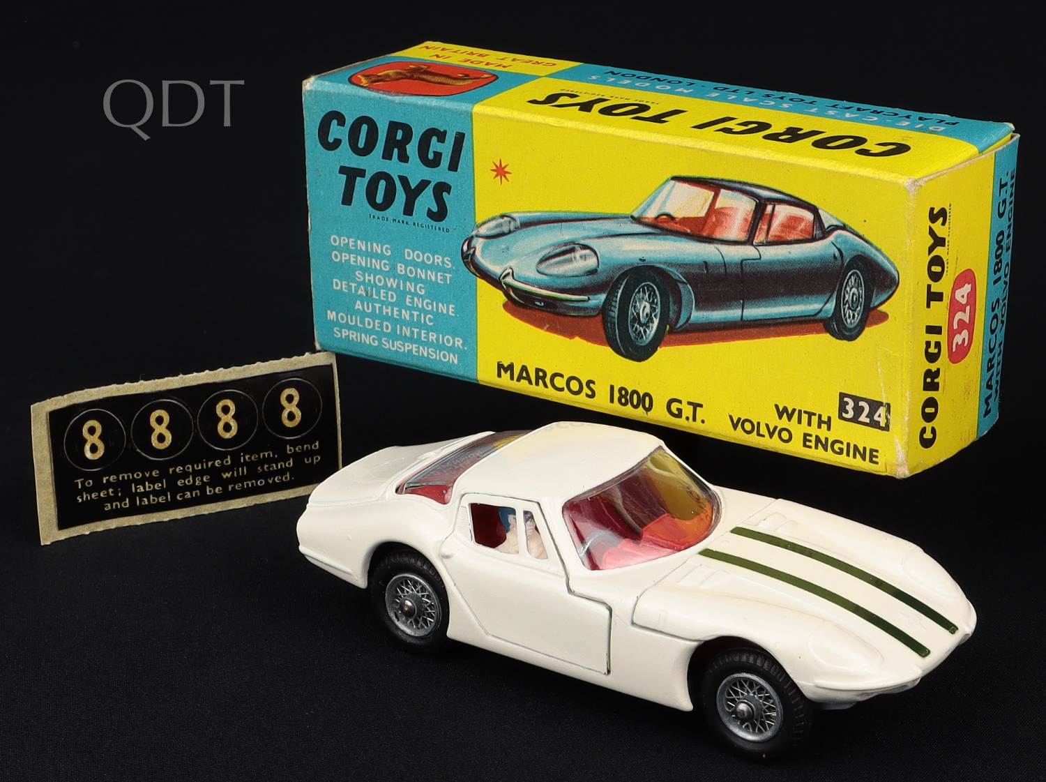 Marcos 1800 G.T. with Volvo engine by Corgi Toys, No. 324. Very near mint/boxed. With unapplied racing numbers. From The Elmer Collection.