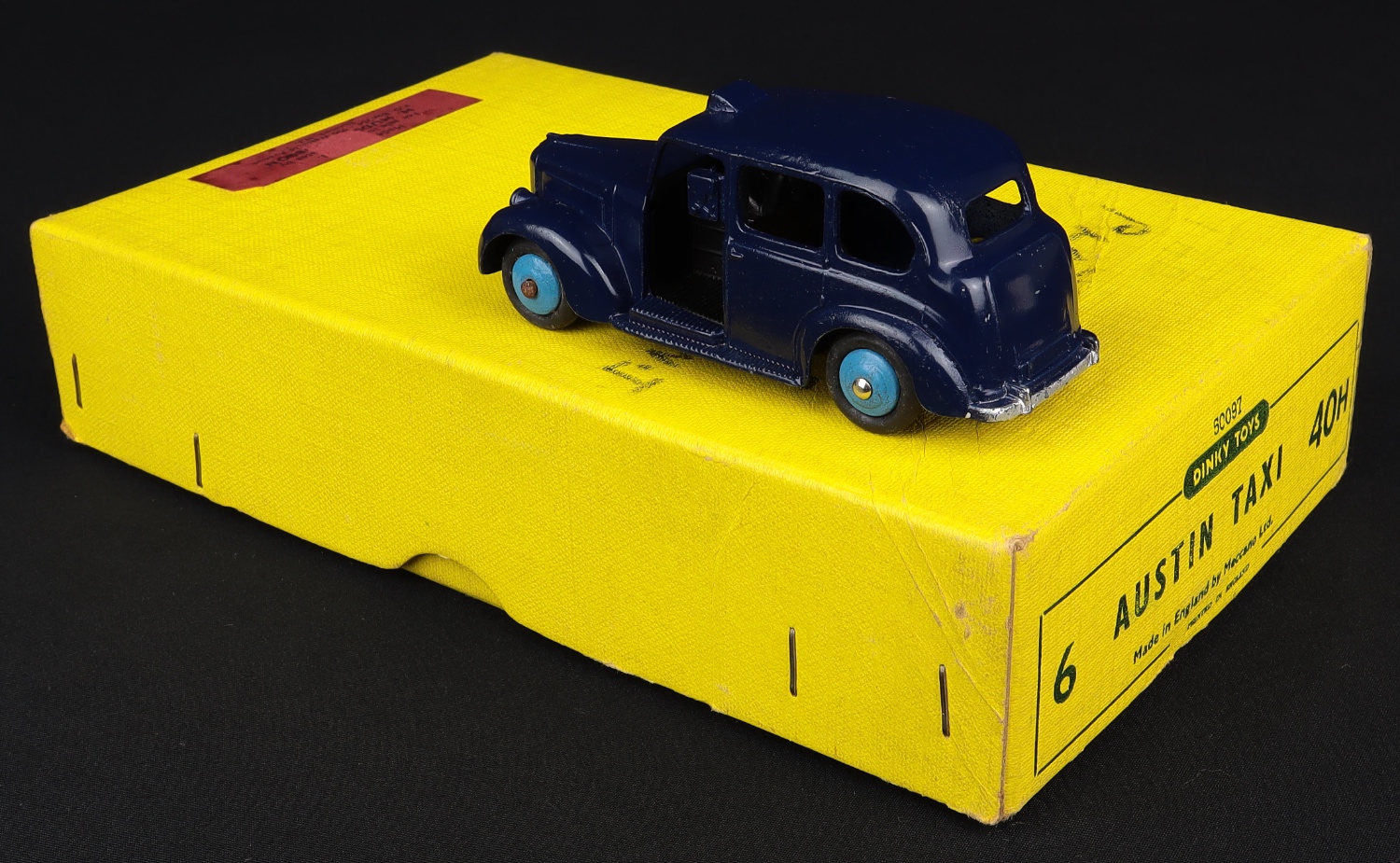 Austin Taxi by Dinky Toys, No. 40H in Trade Box, with dividers. Very near mint/boxed. Scarce version in dark blue from The Reference Collection. Starting bid £150. Please note that QDT apply 12.5% buyer's commission.