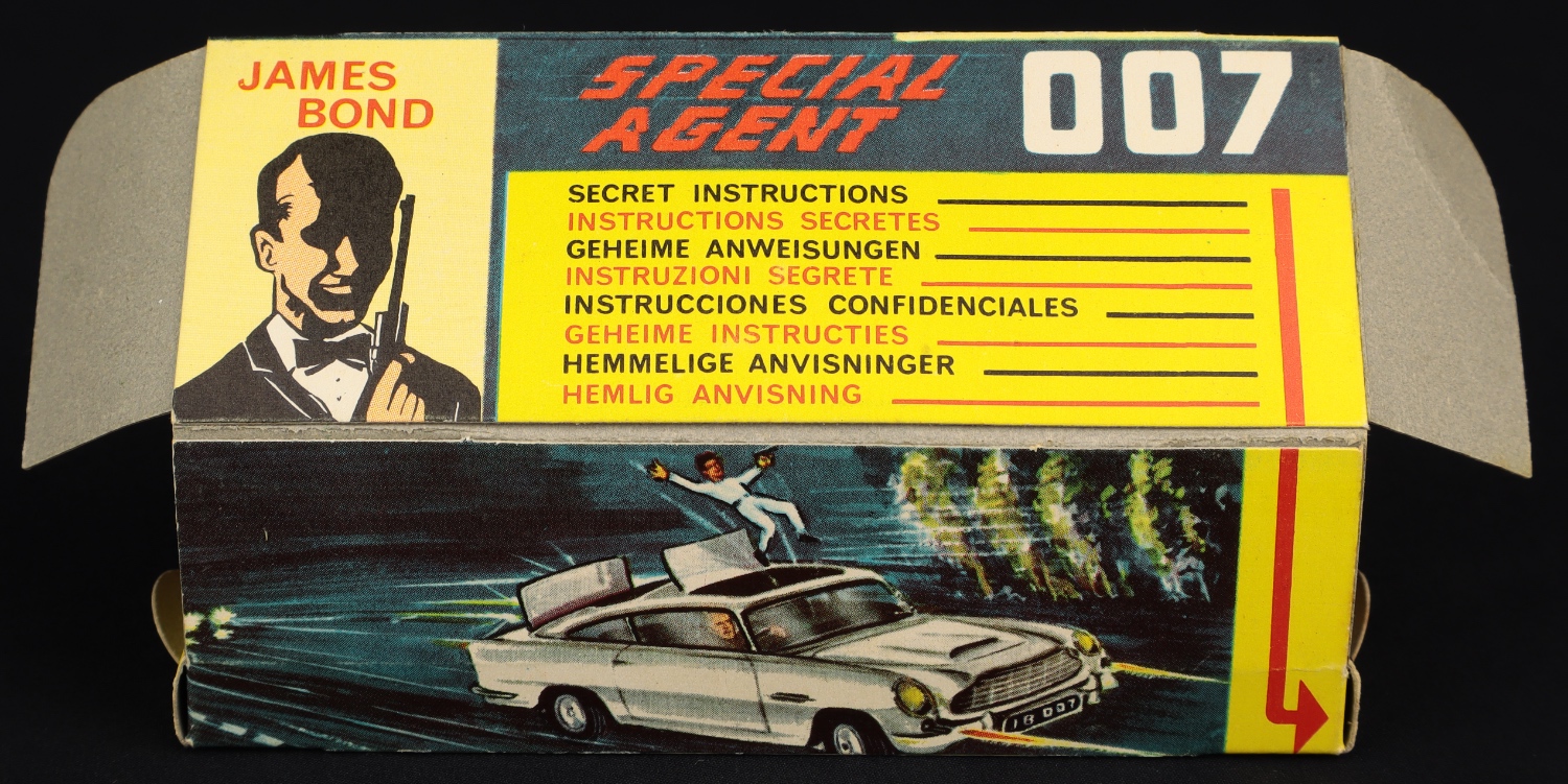 The 1st issue outer box is complete, clean and bright, showing lightest wear only. Note that since it is 1st issue, there is no shading detail around the lettering ASTON MARTIN DB5 on the box face and no thick black border around the JAMES BOND’S lettering, either.