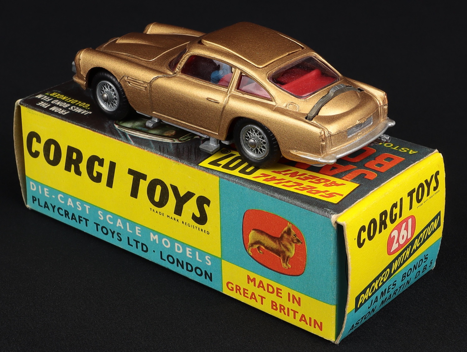 James Bond's Aston Martin D.B.5 by Corgi Toys, No. 261. Gold issue. Very near mint/boxed. 1st issue WITH INDICATOR LIGHT CASTING. 1st issue style box with Secret Instruction Packet (with Instructions & villain only). From The Richmond Collection.
