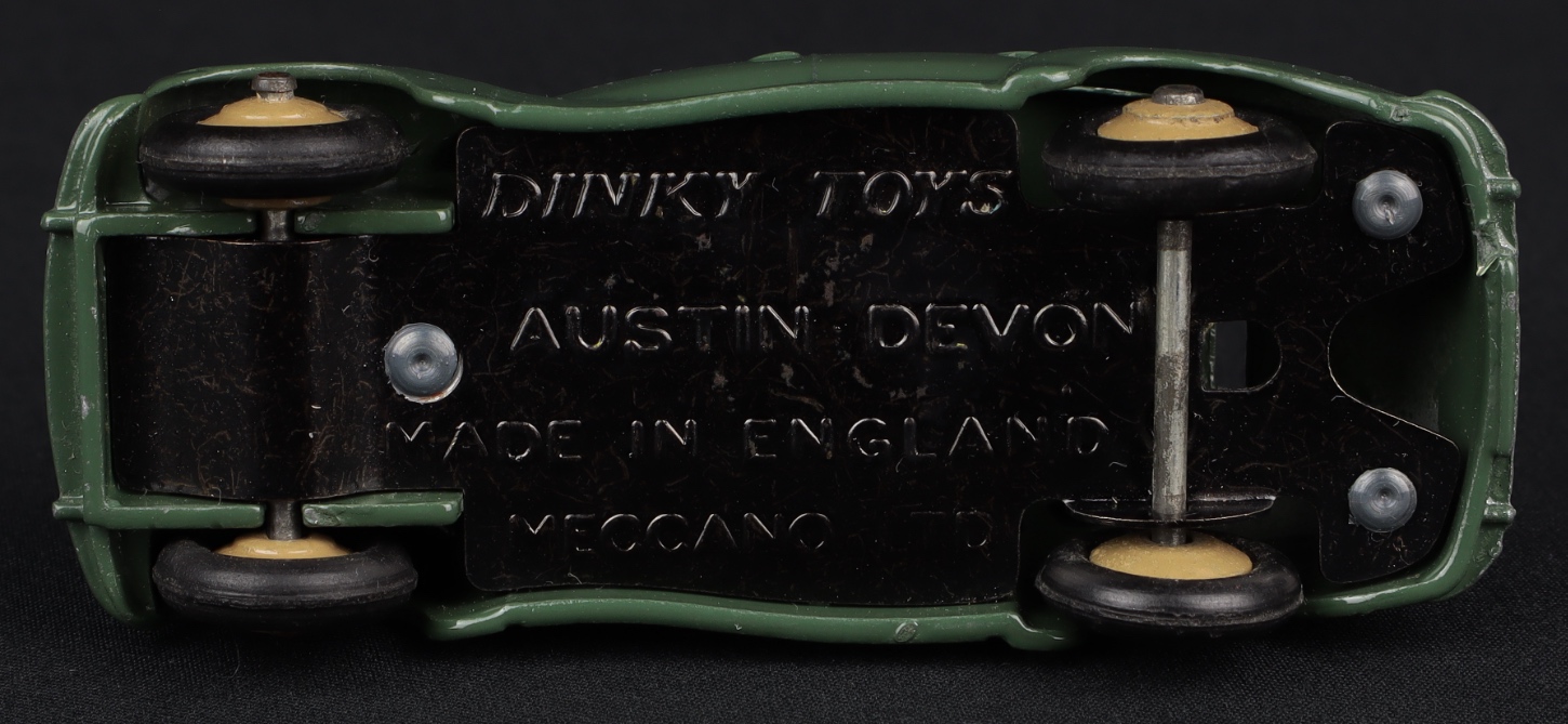 Austin Devon Saloon by Dinky Toys, No. 40D 152. Very near mint. Scarce issue in sage or mid grey-green (darker than suede green) with fawn wheels. From The Reference Collection.