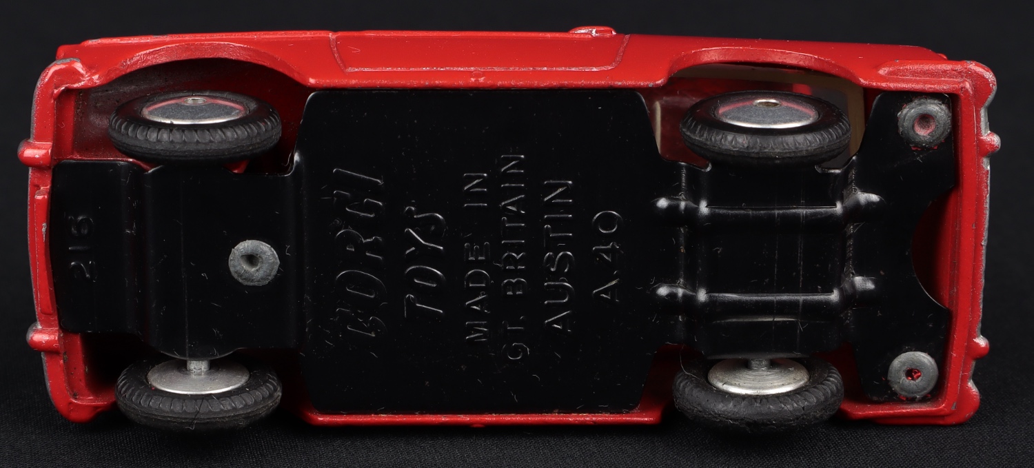 Austin A40 by Corgi Toys, No. 216. Near mint/boxed. Scarce red and black NON-MECHANICAL issue with flat spun wheels. From The Rickman Collection.